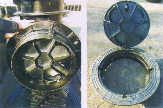 在井蓋外圈上,凸出一方形槽,其井蓋內壁的開口環(huán)通過井座固定軸與并蓋連接,另一-端內壁設鎖體固定,而起到防盜作用,當井蓋打開放置90度時即可取下井蓋,便于施工,暗鎖采用尼龍襯套,永不生銹,并配有專用工具開啟,安全可靠。