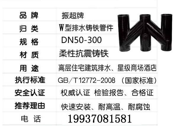振超牌W型鑄鐵排水管件,柔性抗震鑄鐵,快速安裝,耐高溫,耐腐蝕;用于高層住宅建筑排水、星際商場(chǎng)酒店。