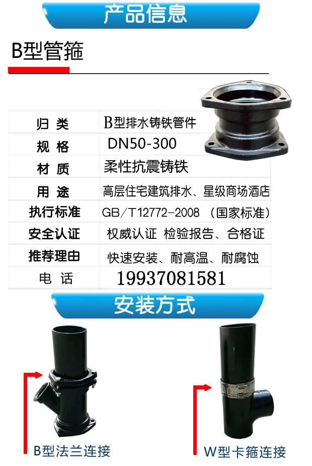 離心機制抗震柔性鑄鐵排水管件B型管箍套袖,柔性抗震鑄鐵,快速安裝,耐高溫,耐腐蝕;用于高層住宅建筑排水、星際商場酒店。