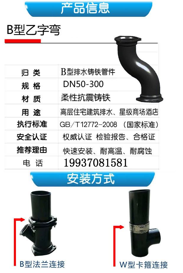 柔性鑄鐵排水管件B型乙字彎廠家,柔性抗震鑄鐵,快速安裝,耐高溫,耐腐蝕;用于高層住宅建筑排水、星際商場酒店。