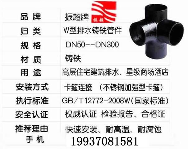 振超牌W型鑄鐵排水管件,柔性抗震鑄鐵,快速安裝,耐高溫,耐腐蝕;用于高層住宅建筑排水、星際商場酒店。
