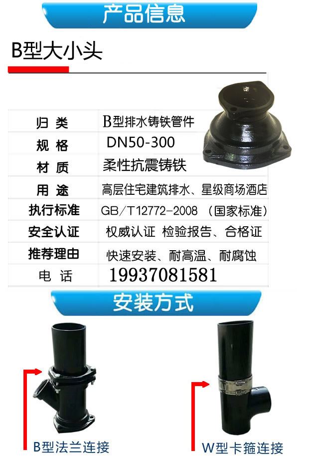 離心機(jī)制抗震柔性鑄鐵排水管件,B型排水鑄鐵管大小頭廠家,柔性抗震鑄鐵,快速安裝,耐高溫,耐腐蝕;用于高層住宅建筑排水、星際商場(chǎng)酒店。