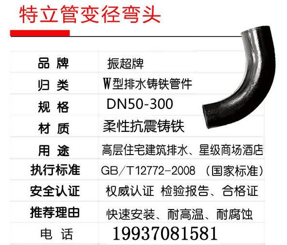W型離心機制柔性抗震鑄鐵排水管件,柔性抗震鑄鐵,快速安裝,耐高溫,耐腐蝕;用于高層住宅建筑排水、星際商場酒店。