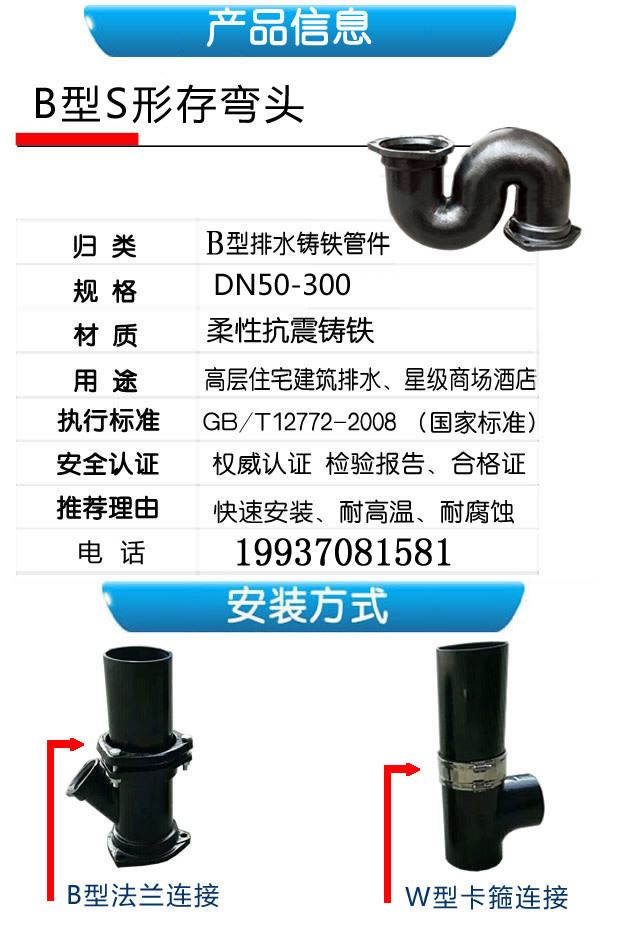 柔性鑄鐵排水管管件B型S形存水彎,柔性抗震鑄鐵,快速安裝,耐高溫,耐腐蝕;用于高層住宅建筑排水、星際商場酒店。