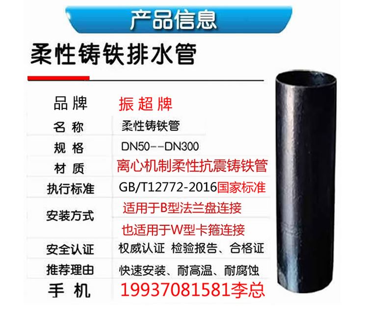 專業(yè)生產銷售振超牌W型B型柔性鑄鐵排水管廠家